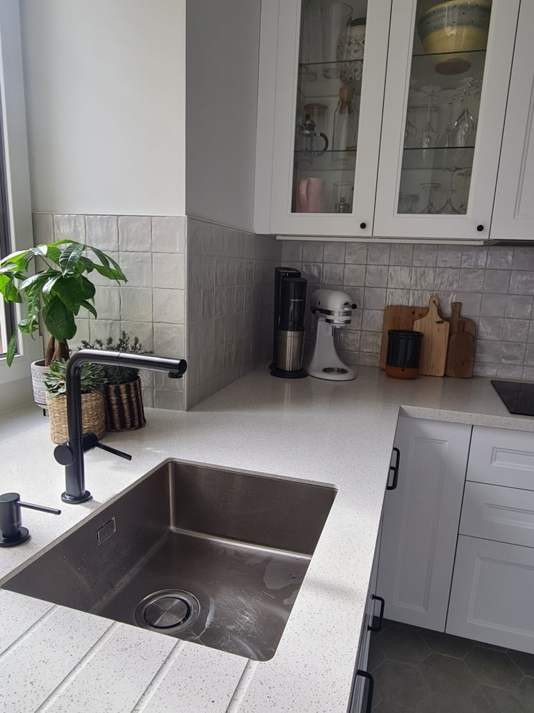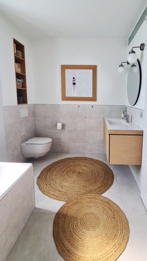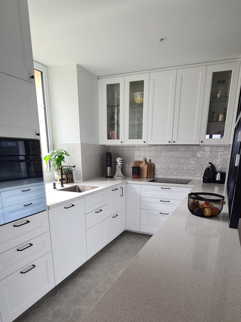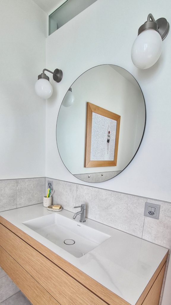 L’ensemble de la maison a été concerné par les travaux : murs, plafonds, installations sanitaires et électriques ont été entièrement remplacés. De nouvelles cloisons ont été mises en place, accompagnées d’une redistribution complète des pièces. Pour aménager la cuisine à l’emplacement initial d’une salle d’eau et d’une chambre, des modifications d’ouvertures en façade ont été nécessaires. Une isolation des murs périphériques intérieurs et des plafonds a également été réalisée, améliorant significativement le confort thermique et acoustique.