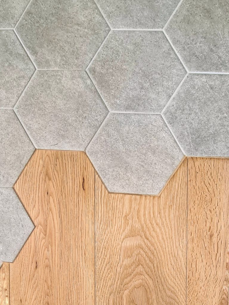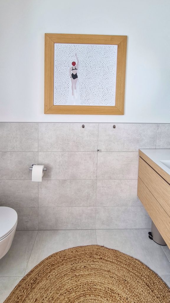 Le rez-de-chaussée accueille désormais une cuisine ouverte sur le séjour, un hall d’entrée séparé par une porte vitrée coulissante, un dressing avec assise intégrée, ainsi qu’un WC.
