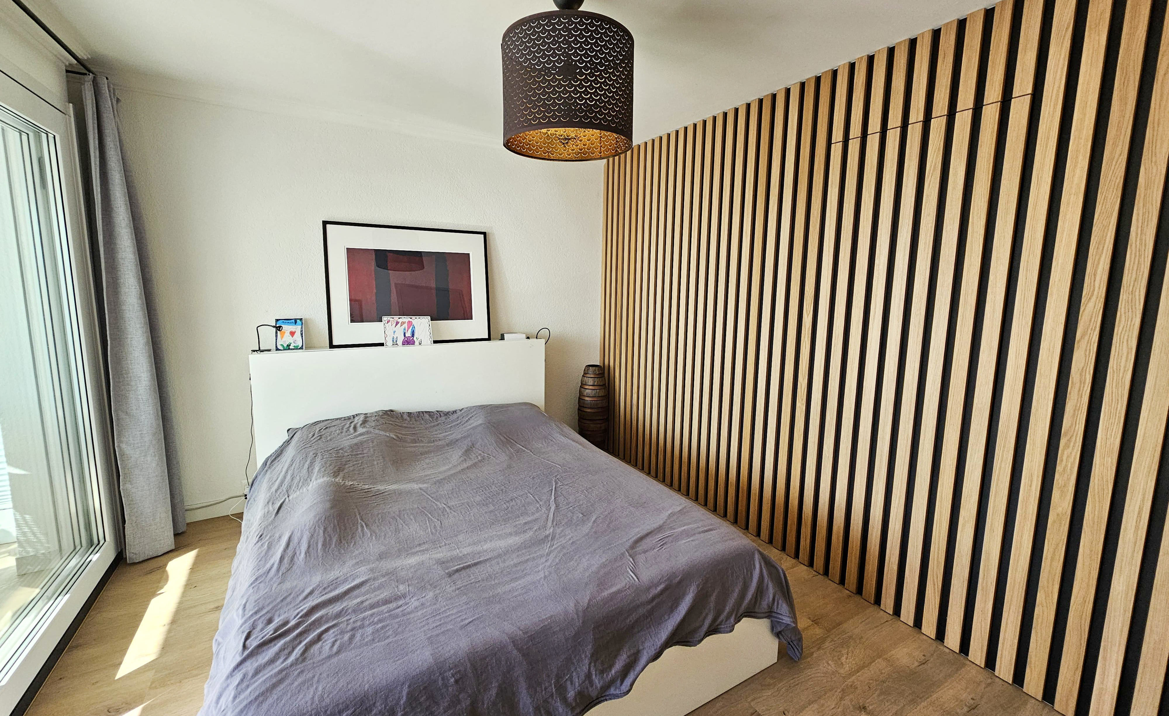 Nous avons été chargés de rénover une chambre parentale afin d’optimiser l’espace et d’apporter plus de dynamisme à la pièce. Pour ce projet, nous avons remplacé l’armoire encombrante par un espace de rangement, en démolissant la paroi existante pour ériger une élégante cloison en bardage bois, dissimulant l’accès au dressing. Ce matériau ajoute chaleur et rythme à l’ensemble. L’espace libéré a permis d’aménager des toilettes, accessibles depuis le couloir, et utilisables par tous les habitants de la maison.