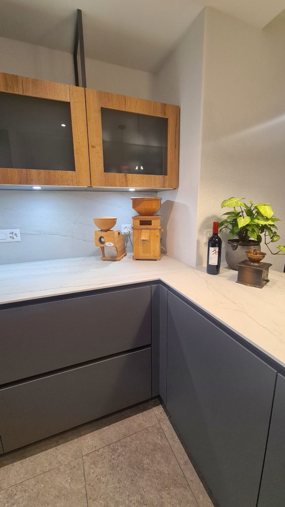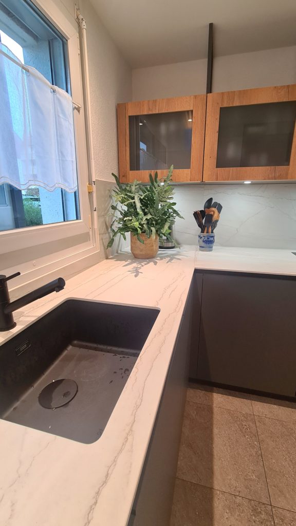 Neuch’Atelier s’est chargé de proposer des projets de rénovation par le biais de croquis et planches d’ambiances. Le sol existant devant être conservé, nous avons réalisé le projet afin qu’il s’harmonise avec celui-ci en amenant des matières nobles pour ajouter de la chaleur à la pièce. Une fois le projet accepté, nous avons fait les appels d’offres et planifié les travaux. La cuisine, l’entrée, le meuble du salon ainsi que certains luminaires ont été changés. Voici le résultat de la cuisine…..