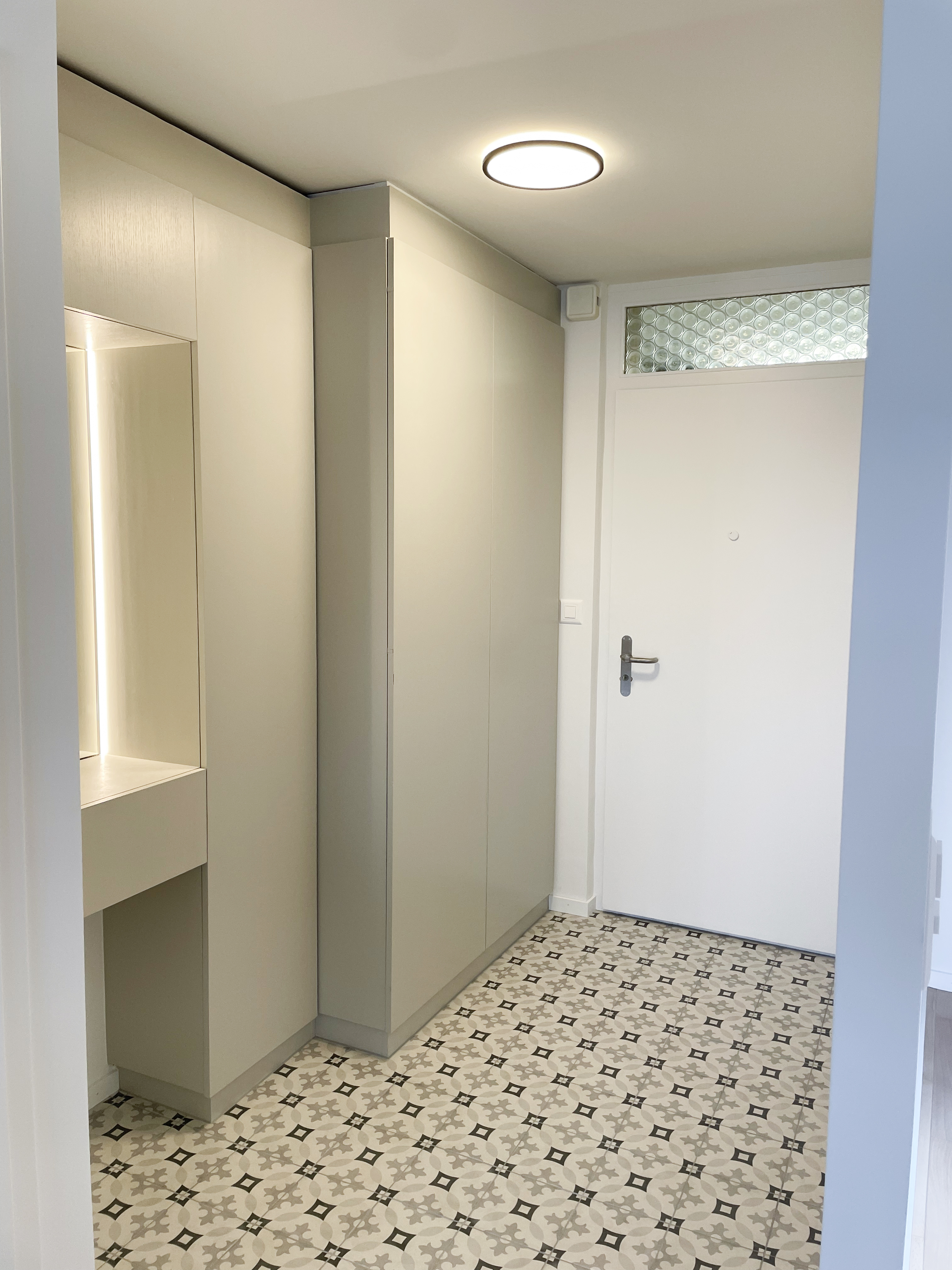 Notre client nous a sollicitées pour rénover l’appartement hérité d’un parent, un projet impliquant de nombreux travaux. Le principal défi a été de moderniser l’aménagement de l’espace et le remettre au goût du jour, tout en conservant le paquet existant. Cette transformation a permis d’apporter des espaces plus lumineux et plus optimisés.